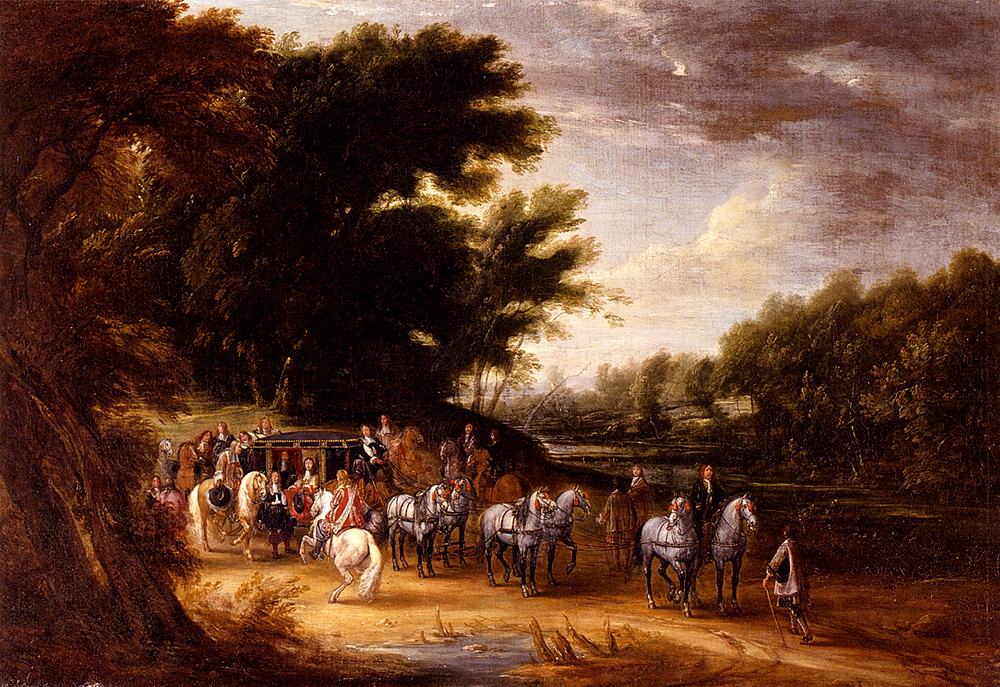 Hand-finished oil painting reproduction of “Louis XIV in a State Coach Accompanied by his Gentlemen” by Frans van der Meulen Adam — rich texture, ready for framing.